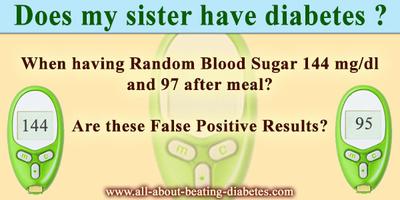 QUESTION: My sister took a random sugar test before meal and it was 144 and then approx two-three hrs. after meal and it 97. Could you tell me if she has diabetes?